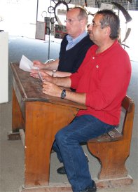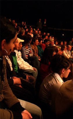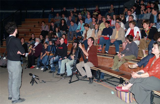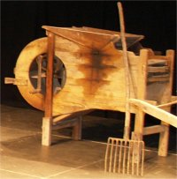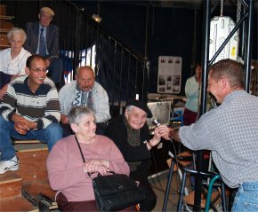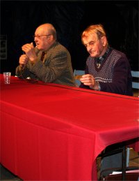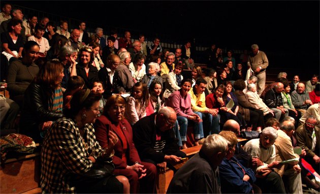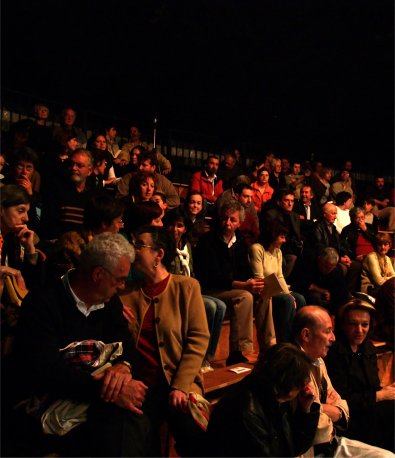 Tout le monde s'est mis en place sur les gradins pour écouter Messieurs QUEREILLHAC et DESTOURNES, écrivains-poètes-paysans-gascons locaux nous parler de la VIE AUTREFOIS à la CAMPAGNE et à la VILLE sur la scène de CIRCUITS, soutenus par un décor de Vieux Outils et des documents numériques projetés sur écran. |