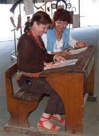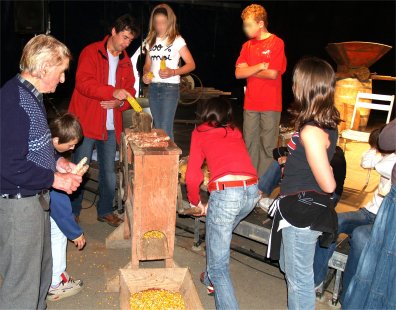 La journée commençait par l'arrivée de 16 élèves du collège de PLAISANCE accompagné de leur professeur d'occitan, M. BERNISSAN. Parmi les vieux objets et outils exposés, ils découvraient notamment le dégrenoir à maïs qu'ils ont fait fonctionner énergiquement sous les conseils d'Alban DESTOURNES. |