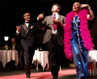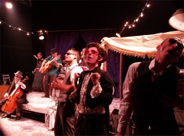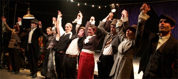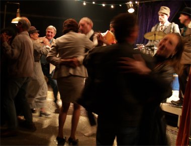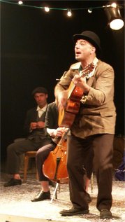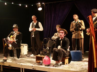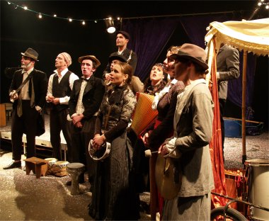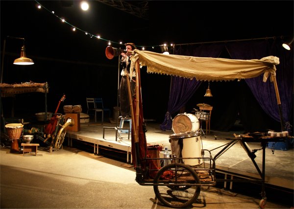 Pour tout décor, un plateau et deux charettes-orchestre avec des instruments de musique. Si CABARET se passe sur la scène de CIRCUITS Nomades, il gagne rapidement l'ensemble du chapiteau. Les comédiens vont dès le début du spectacle à la rencontre du public et les invitent à prendre part à leur fabuleux voyage. |