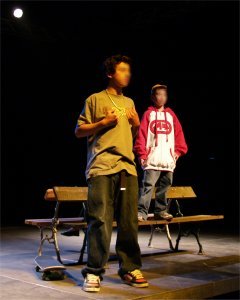 BROCELIANDE'S PARK est un spectacle écrit et mis en scène par Cyril PUERTOLAS de la Compagnie "La Petite Pierre", secondé par Carmela ACUYO. Dans un parc en béton, un soir d'été, des adolescents se retrouvent. Sont également au rendez-vous Shakespeare et les Chevaliers de la Table Ronde. De scènes réalistes en passages oniriques c'est, en filigrane, de quête d'identité dont il est question. Mais tout ça évidemment sans se prendre au sérieux. |