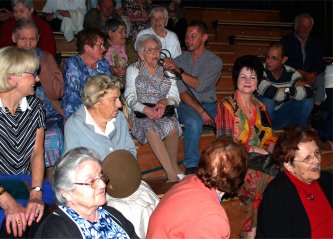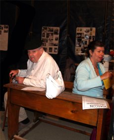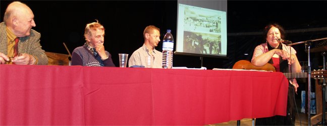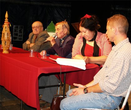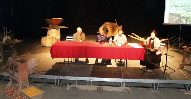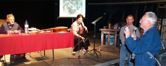 Tout le monde s'est mis en place sur les gradins pour écouter Messieurs QUEREILLHAC et DESTOURNES, écrivains-poètes-paysans-gascons locaux nous parler de la VIE AUTREFOIS à la CAMPAGNE et à la VILLE sur la scène de CIRCUITS, soutenus par un décor de Vieux Outils et des documents numériques projetés sur écran. |